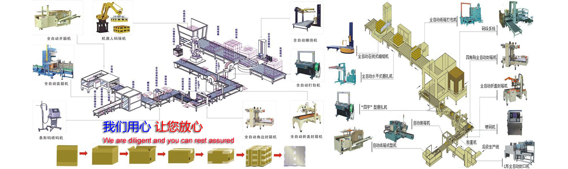我司可根據(jù)不同產(chǎn)品及要求設(shè)計(jì)定制整條紙箱包裝線(xiàn),從紙箱成型到最后碼垛纏繞膜包裝。適用于瓶裝,袋裝,罐裝等產(chǎn)品。歡迎來(lái)信來(lái)電咨詢(xún)。